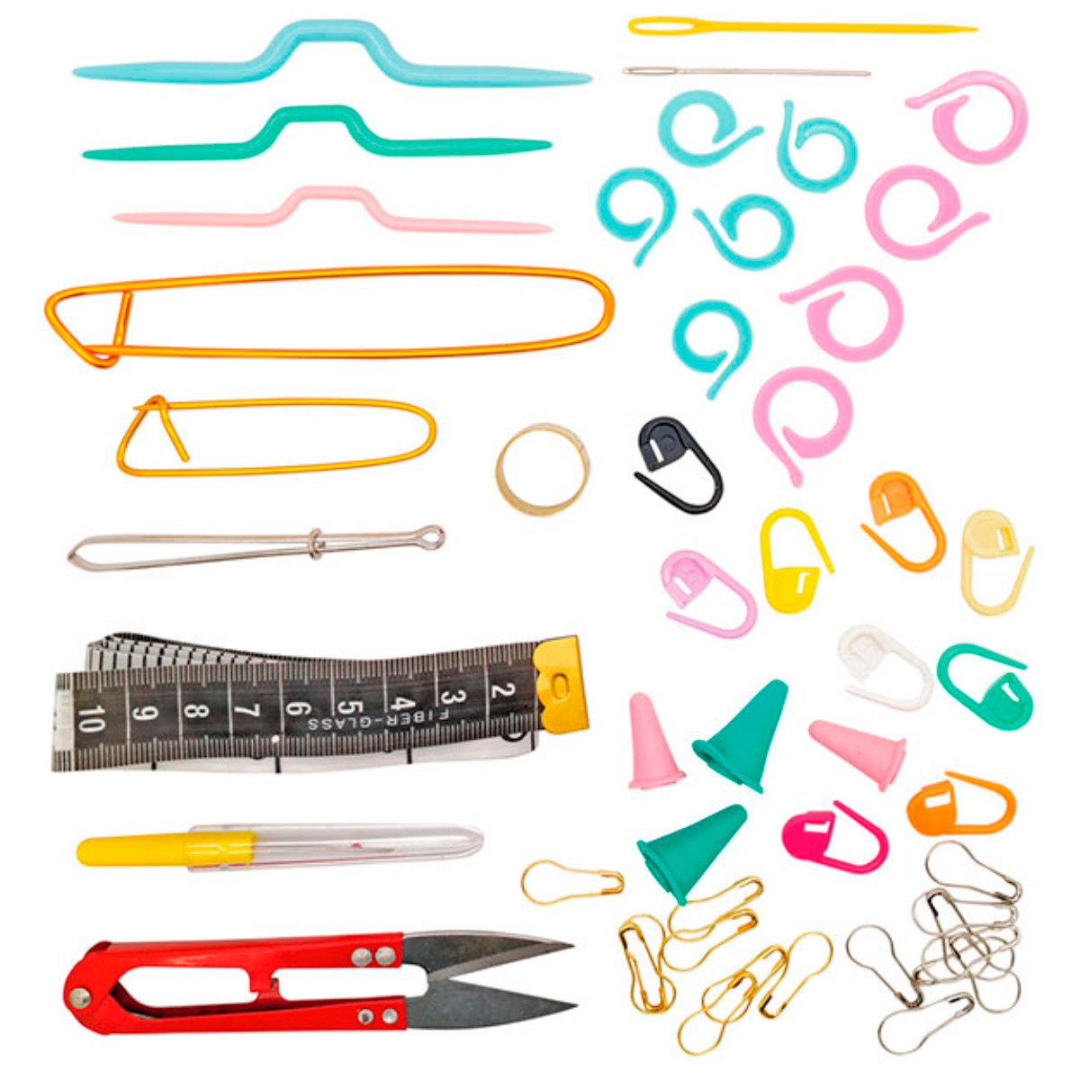 Набор принадлежностей для вязания (состав:ножницы для ниток (пластик/металл), булавки для незакрытых петель (алюминий) 2шт, спицы вспомогательные для кос (пластик), протяжная игла (металл), устройство для распаривания шва (пластик/металл), рулетка длиной 60см, наперсток (металл), наконечники для спиц (пластик/резина) 4шт, игла (металл), игла для пряжи (пластик), маркер для вязания (пластик) 20шт, английские булавки (металл) 16шт)
