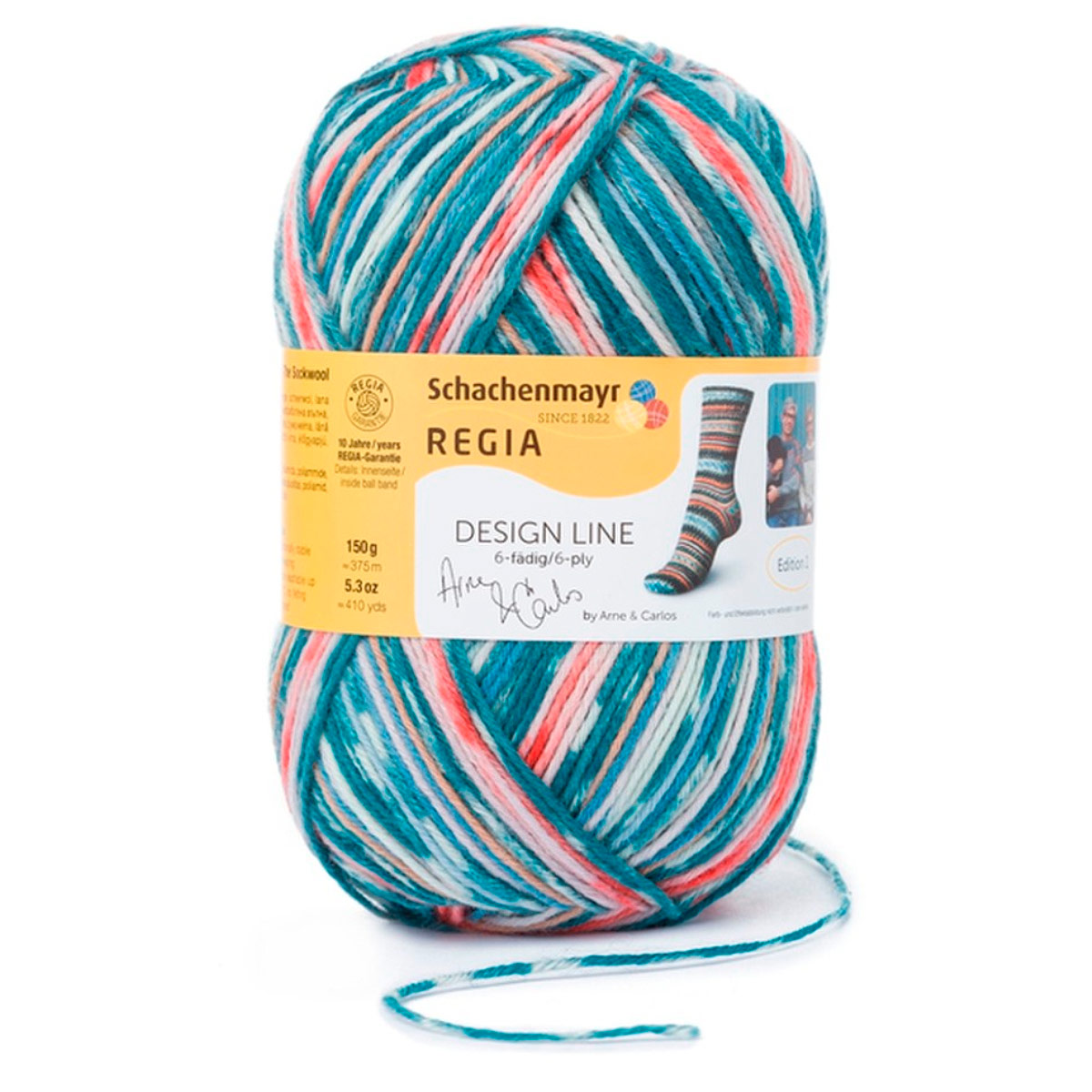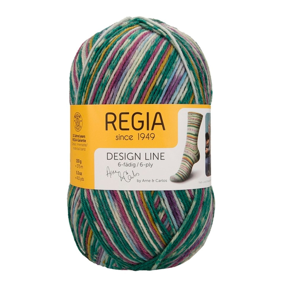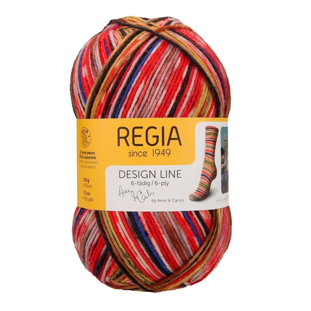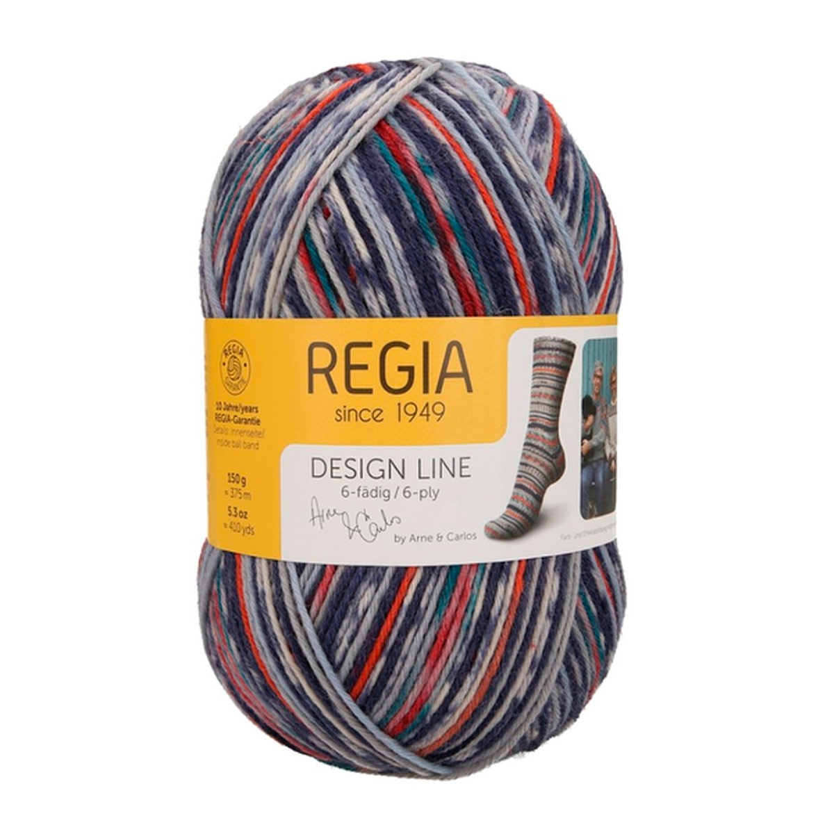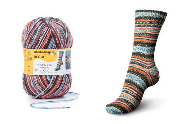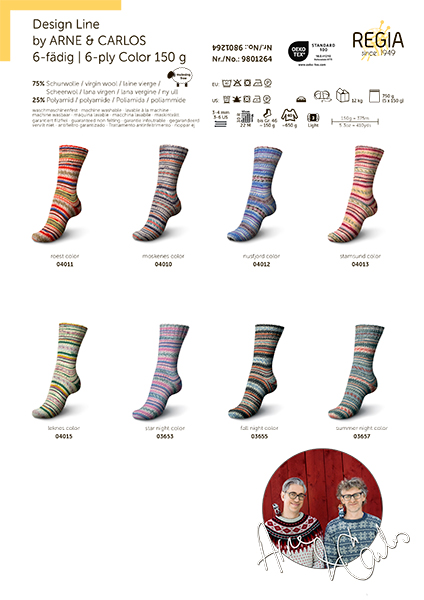 Regia Design Line – это коллекция немецкой пряжи для вязания носков и других изделий. Она отличается высокой износостойкостью, насыщенными дизайнерскими цветами и превосходным качеством. Regia Arne & Carlos – результат сотрудничества с известными дизайнерами. В этой линейке представлены уникальные расцветки и узоры: полосатые, меланжевые, градиентные, которые вдохновляют на создание самых смелых вязаных изделий. Пряжа подходит для носков, а также для легких свитеров, шапок и перчаток. Она прочная, с яркими цветами, удобна в работе, не колется и хорошо скользит по спицам. Можно стирать и сушить в стиральной машине при низкой температуре.Одного мотка пряжи хватит на носки до 46 размера, а для свитера того же размера потребуется около 5 мотков.