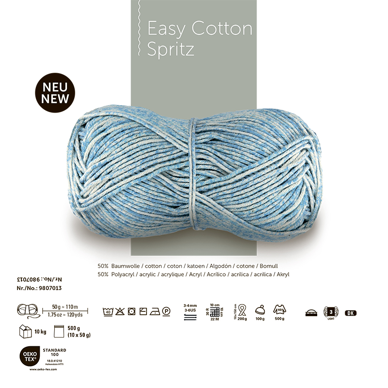 EASY COTTON SPRITZ— это пряжа от немецкого бренда Schachenmayr, известного своей высококачественной пряжей для вязания и рукоделия. Пряжа Easy Cotton Spritz-отличный выбор для вязальщиц, которые ищут качественную хлопковую пряжу для своих проектов. Она состоит из натурального хлопка и обладает мягкой текстурой, хорошей воздухопроницаемостью и гигроскопичностью. Это делает её идеальной для весенне-летних изделий: одежды, аксессуаров и декора. Название "Spritz" намекает на интересную текстуру или метод окраски. Эффект распыления краски создаёт плавные переходы цвета без повторов, придавая пряже летний элегантный оттенок. Округлая структура нити позволяет создавать как ровные, так и текстурированные узоры, что делает её универсальной для различных проектов. Easy Cotton Spritz подходит для вязания топов, поло, пуловеров, сумок и элементов декора. Она комфортна в носке и проста в уходе. Классическая, красиво скрученная пряжа отлично сохраняет форму. Её рекомендуется стирать при температуре 40 °C и сушить горизонта
