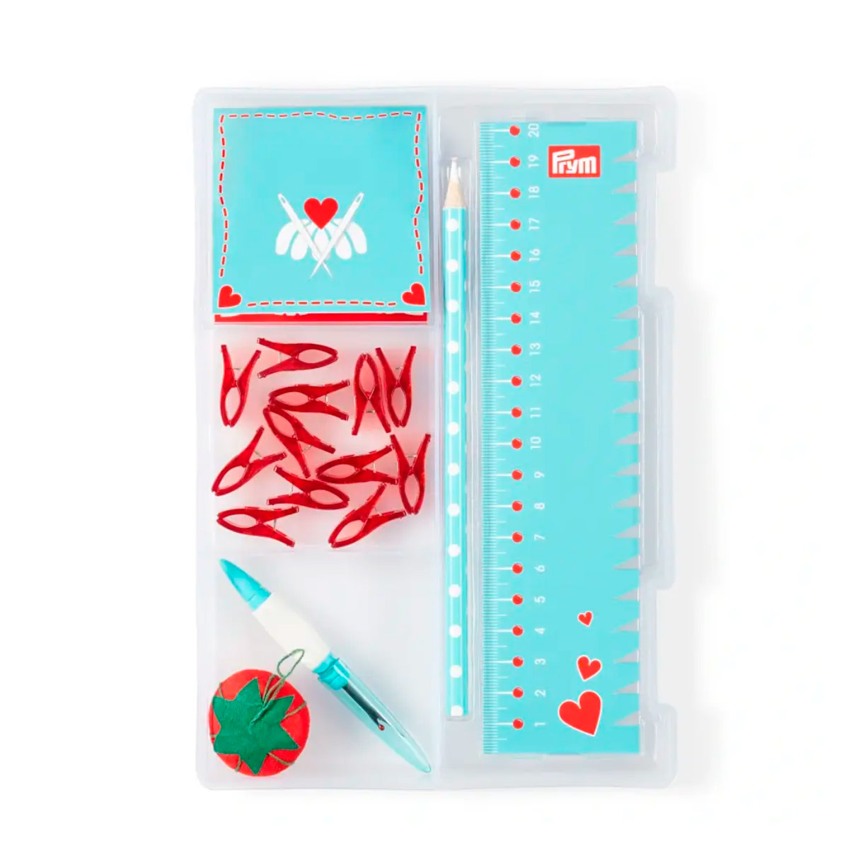 Серия "Prym Love" - Базовый набор "Шитье" (состав: бокс 16*25см пластик, ножницы портновские, ассортимент швейных иголок 15шт в упаковке, магнитная игольница с наполнением (9г булавок 0,6*30мм с цветными головками), линейка для разметки и измерения, маркер для ткани, устройство для распарывания швов "Ergonomic", игольница "Томат", прищепки для работы с тканями 12шт)