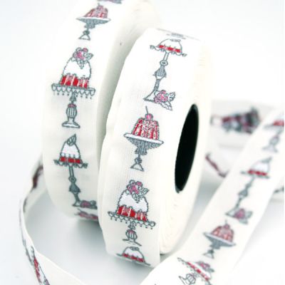 Тесьма декоративная "Пирожные", ширина 20мм (основа 100% полиэстер, рисунок 100% хлопок), белый/красный/серый