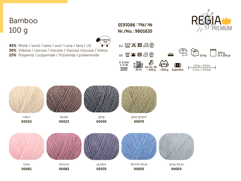 Regia Premium BAMBOO - это изысканная пряжа от немецкого бренда Regia, объединяющая экологичность бамбука с высоким немецким качеством. Она идеально подходит для создания легких вещей, которые дышат, приятно ощущаются на коже и имеют благородный блеск. Бамбуковое волокно в три раза мягче хлопка, гипоаллергенно и подходит для чувствительной кожи и детей. Оно отлично отводит влагу, сохраняя прохладу, и препятствует размножению бактерий. Пряжа легко скользит по спицам, не расслаивается в процессе вязания и красиво ложится в узоры. Premium BAMBOO - это выбор для тех, кто ценит комфорт и экологичность, а также для всесезонного вязания. Чтобы сохранить её свойства, стирайте в стиральной машине при 30 градусах и сушите в расправленном виде.Одного мотка пряжи хватит на носки до 46 размера, а для свитера того же размера потребуется 5 мотков.