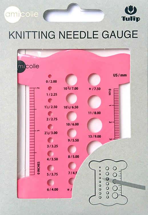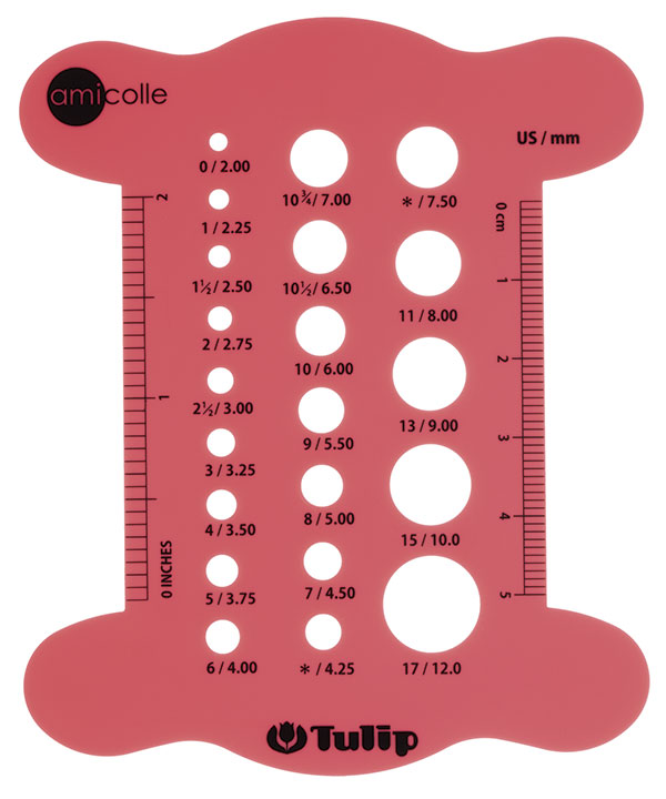 При помощи этой линейки можно легко определить диаметр спиц, а также плотность вязания полотна.