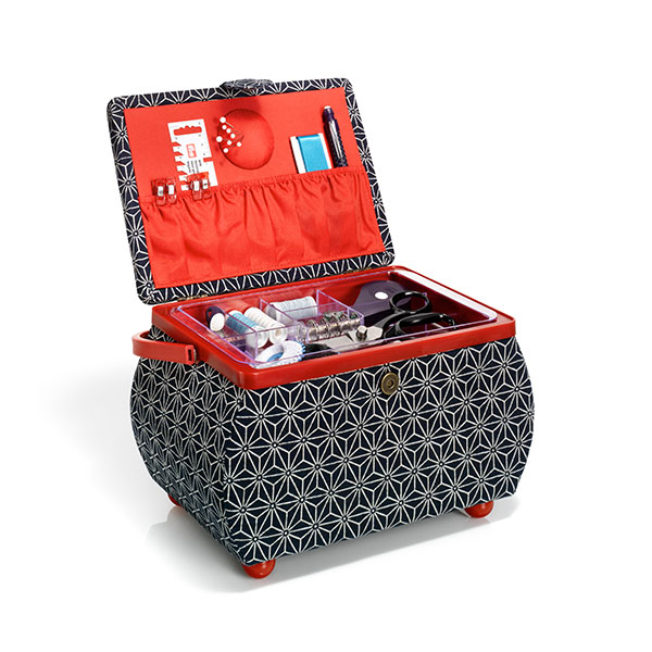 Большая, выпуклая корзина для рукоделия «Kyoto» очаровывает своим оригинальным видом. Темно-синяя хлопчатобумажная обивка с современным геометрическим рисунком удачно контрастирует с ручкой и исключительно привлекательной красной окантовкой. Внутри корзина для рукоделия также может многое предложить: выдержанный в красном, великолепный интерьер обнаруживает много места для хранения швейных принадлежностей. Съемная пластиковая вставка с семью практичными отделениями обеспечивает достаточное пространство для хранения мелкой галантереи, например, наперстков или катушек. Внутренняя часть крышки содержит игольницу и два пришитых тканевых кармана для дополнительных принадлежностей, таких как измерительные ленты, ручки и многого другого.