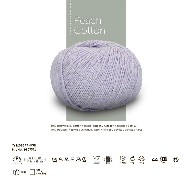 Инновационная пряжа с персиковым оттенком. Смесь хлопка и высокообъемного акрила придает пряже бархатистый оттенок с микротекстурой. Кроме того, пряжа Пич Коттон необычайно легкая, благодаря специальной конструкции, и имеет, но при этом  имеет сверхдлинный метраж 175 м на 50 г, что способствует  снижению расхода пряжи.