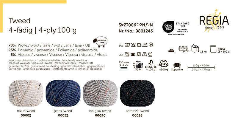 Пряжа Regia - премиальный материал, известный прочностью, износостойкостью и безупречной окраской. Regia Tweed - твидовая линейка пряжи которая сочетает в себе качество Regia и классическую «крапчатую» текстуру твида, что делает ее идеальной для уютных, стильных вещей в винтажном или скандинавском стиле.. Вы можете выбрать 4-ниточный или 6-ниточный твид.Твидовая пряжа обладает износостойкостью, уютной текстурой, мягкостью (мериносовая шерсть не колется), стойкостью цвета (не линяет при стирке). Она лучше всего смотрится в простой вязке, отлично держит форму, не скатывается. В красивых натуральных оттенках с благородной фактурой твид подходит для частой носки.Regia Tweed - отличный выбор для теплых и стильных вещей! Одного мотка пряжи хватит на носки до 46 размера, а для свитера того же размера потребуется 5 мотков.